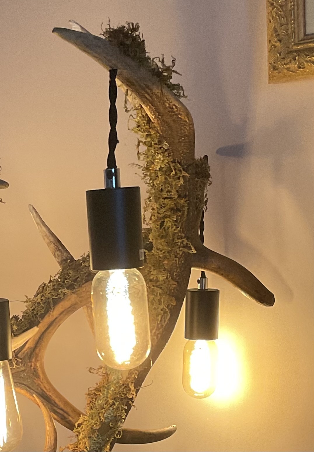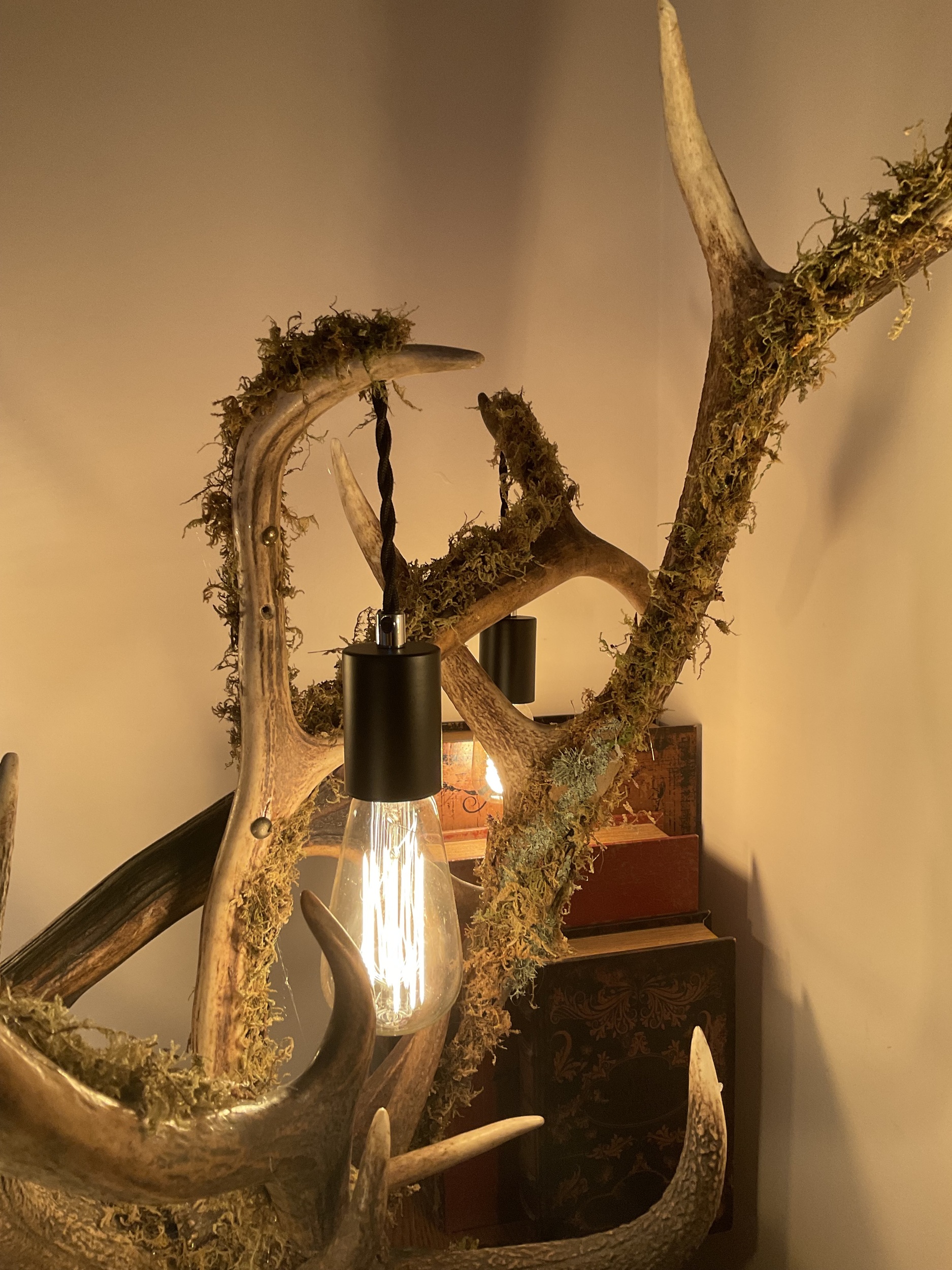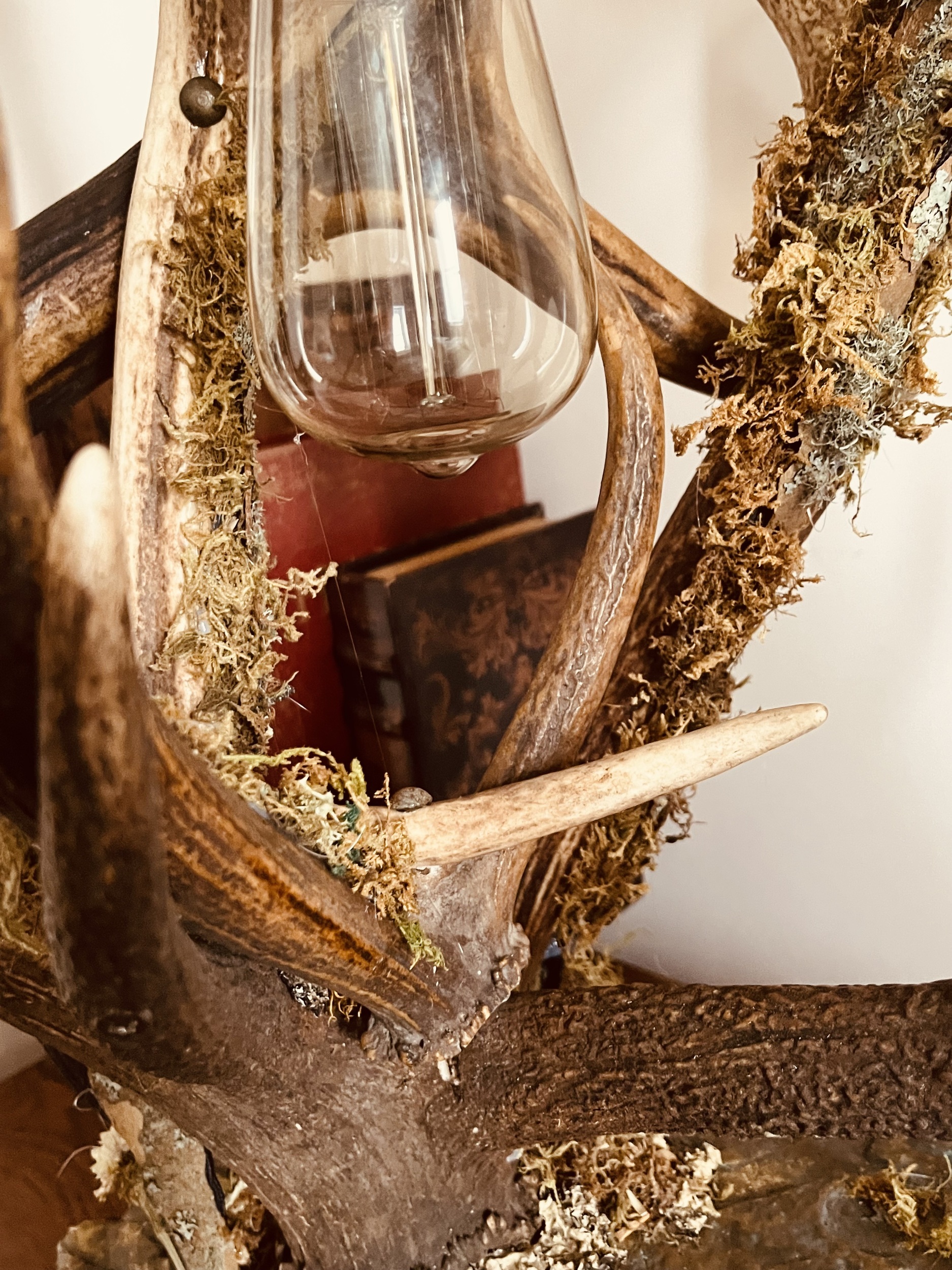 Lit with 5 vintage Edison light bulbs with vintage cord wiring and covered with antique lichen and moss creates the finishing touch.