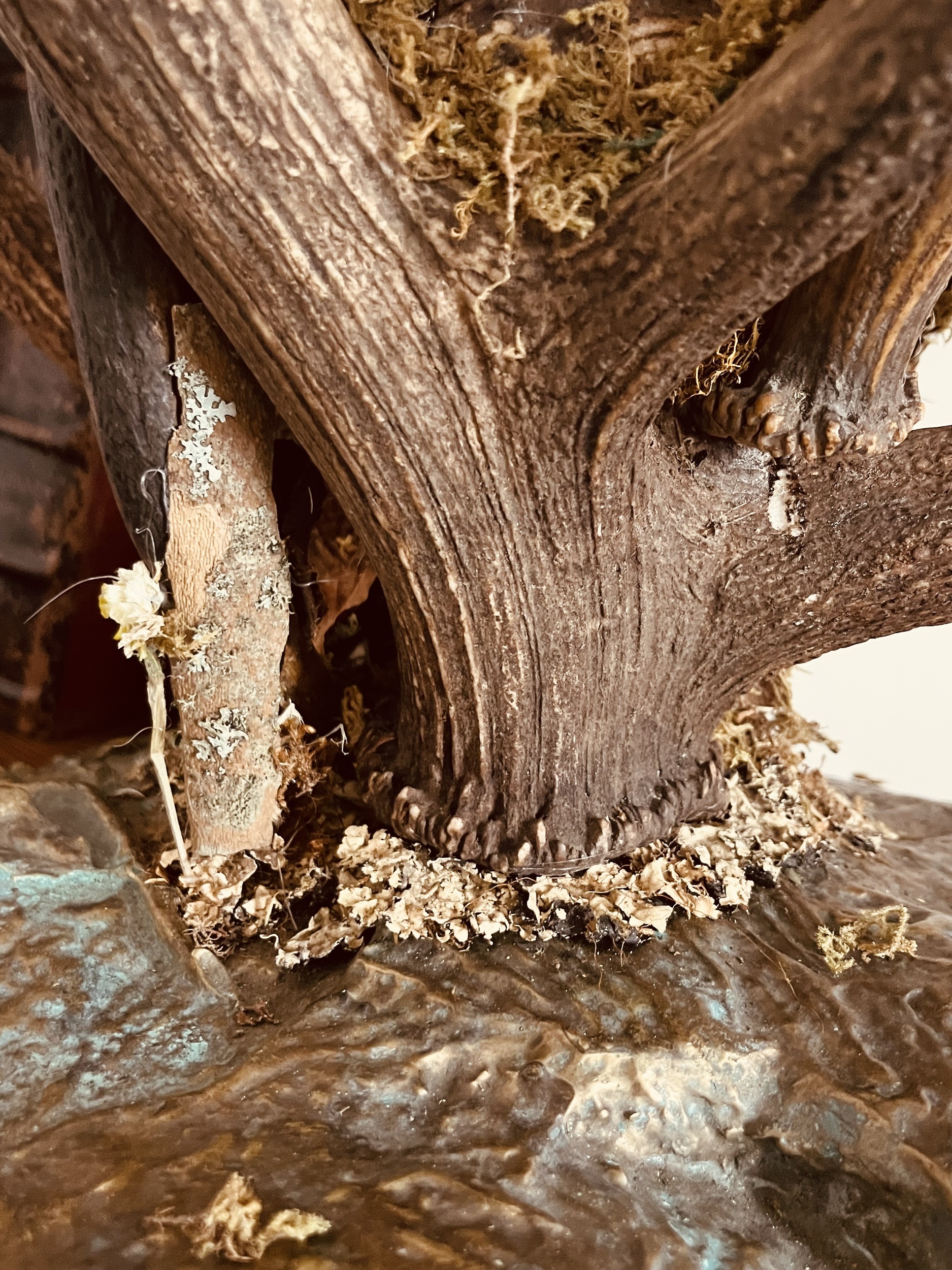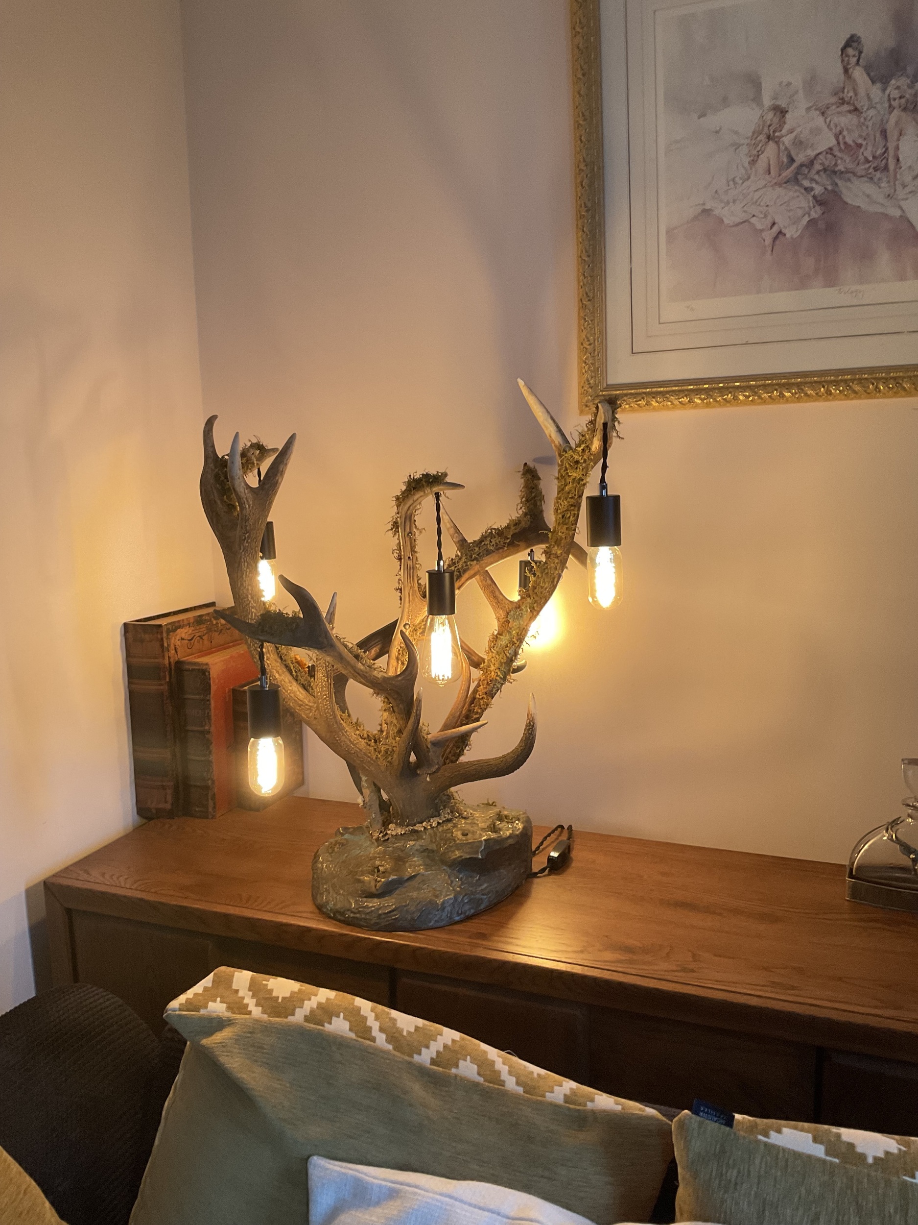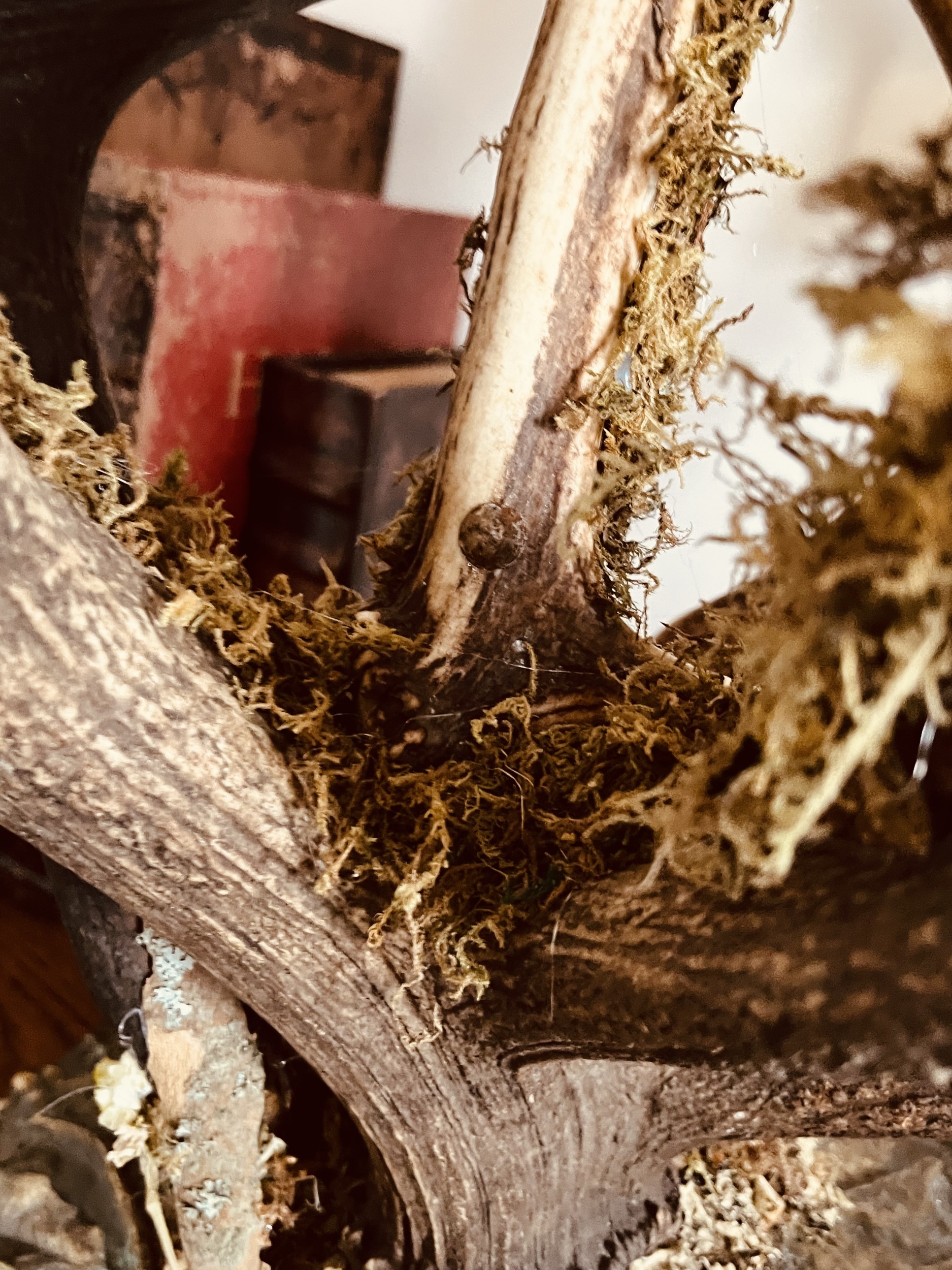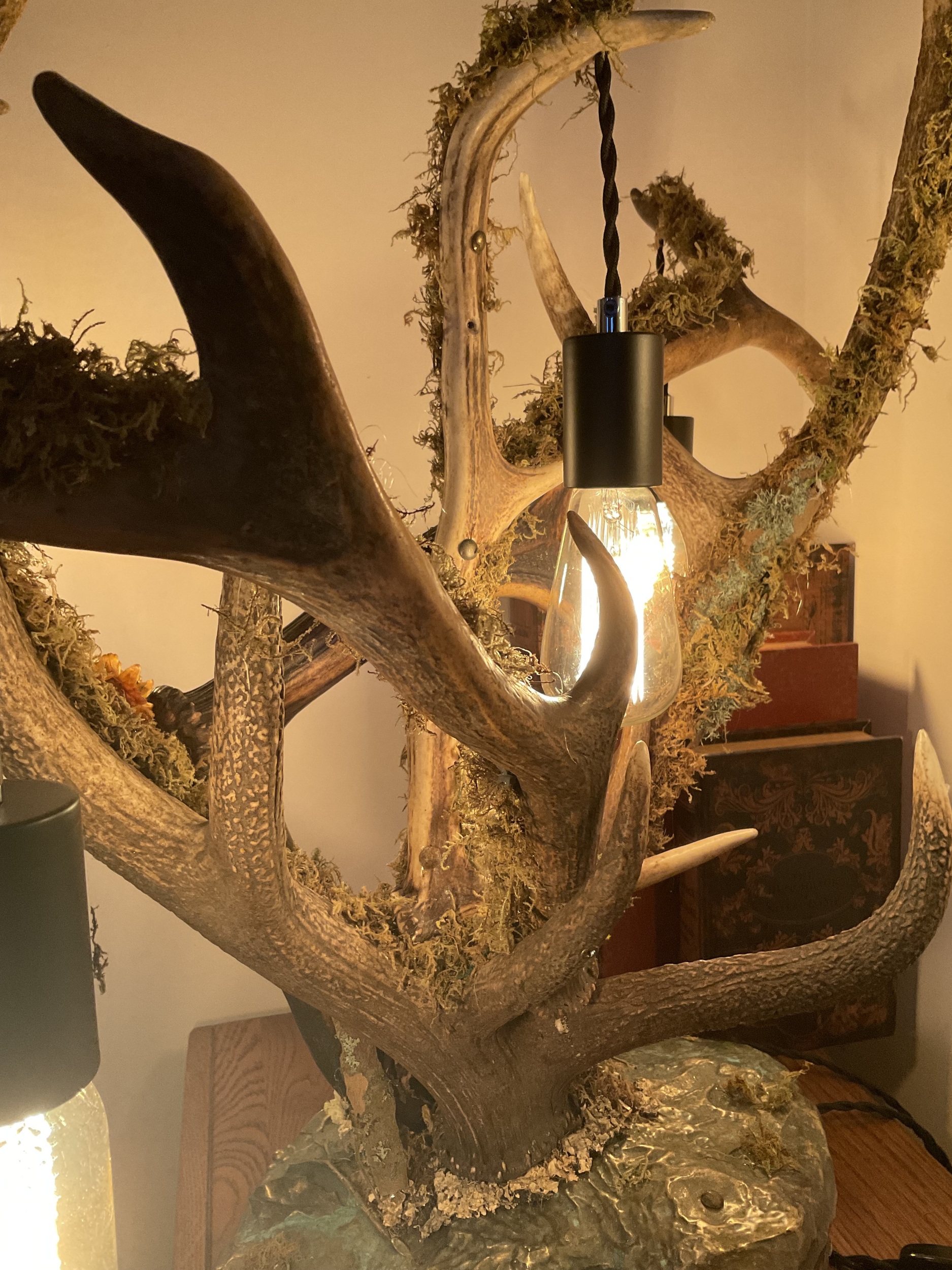 Lit with 5 vintage Edison light bulbs with vintage cord wiring and covered with antique lichen and moss creates the finishing touch.