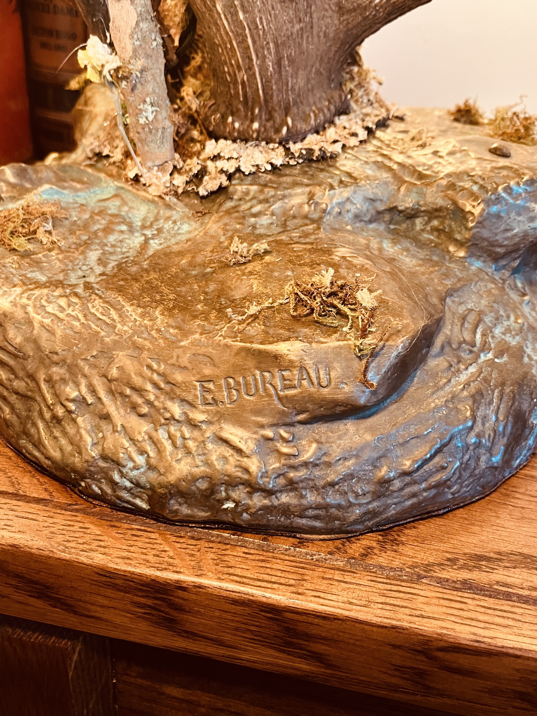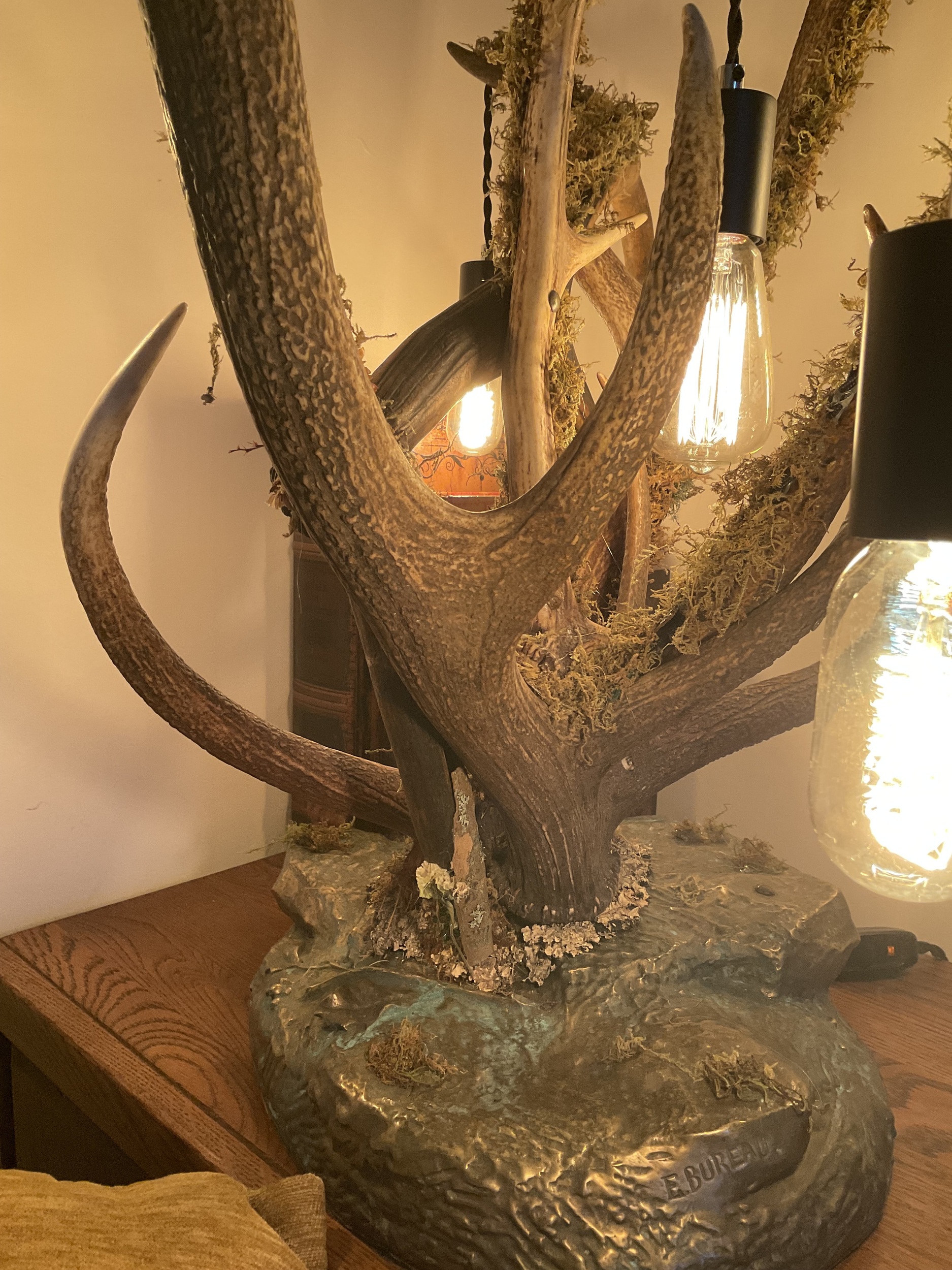 Five various ethically sourced deer antler branches have been used to create this amazing atmospheric lamp. It has been built on a late 19th century French ornately cast bronze base, depicting naturalistically cast leaves and foliage.