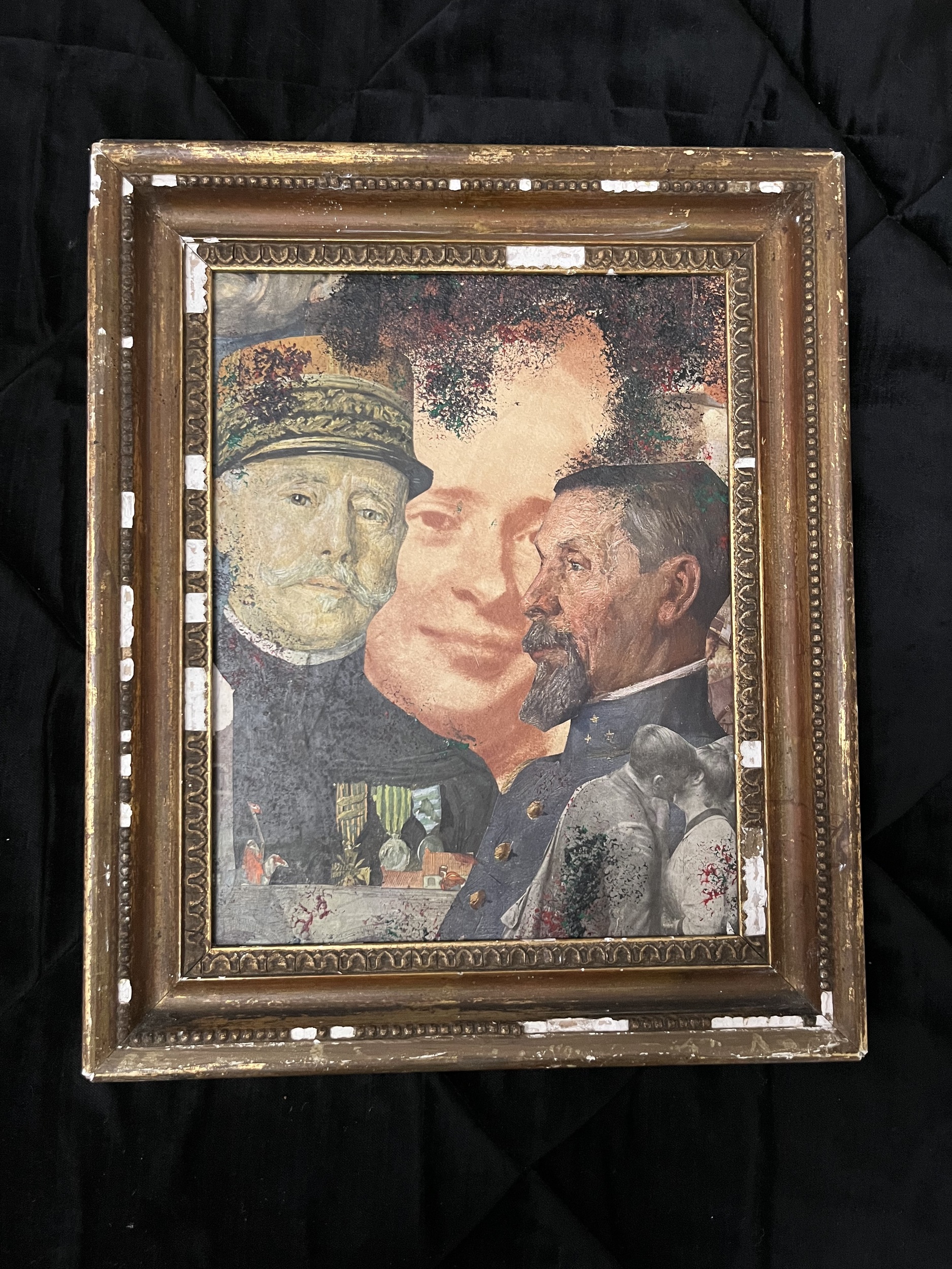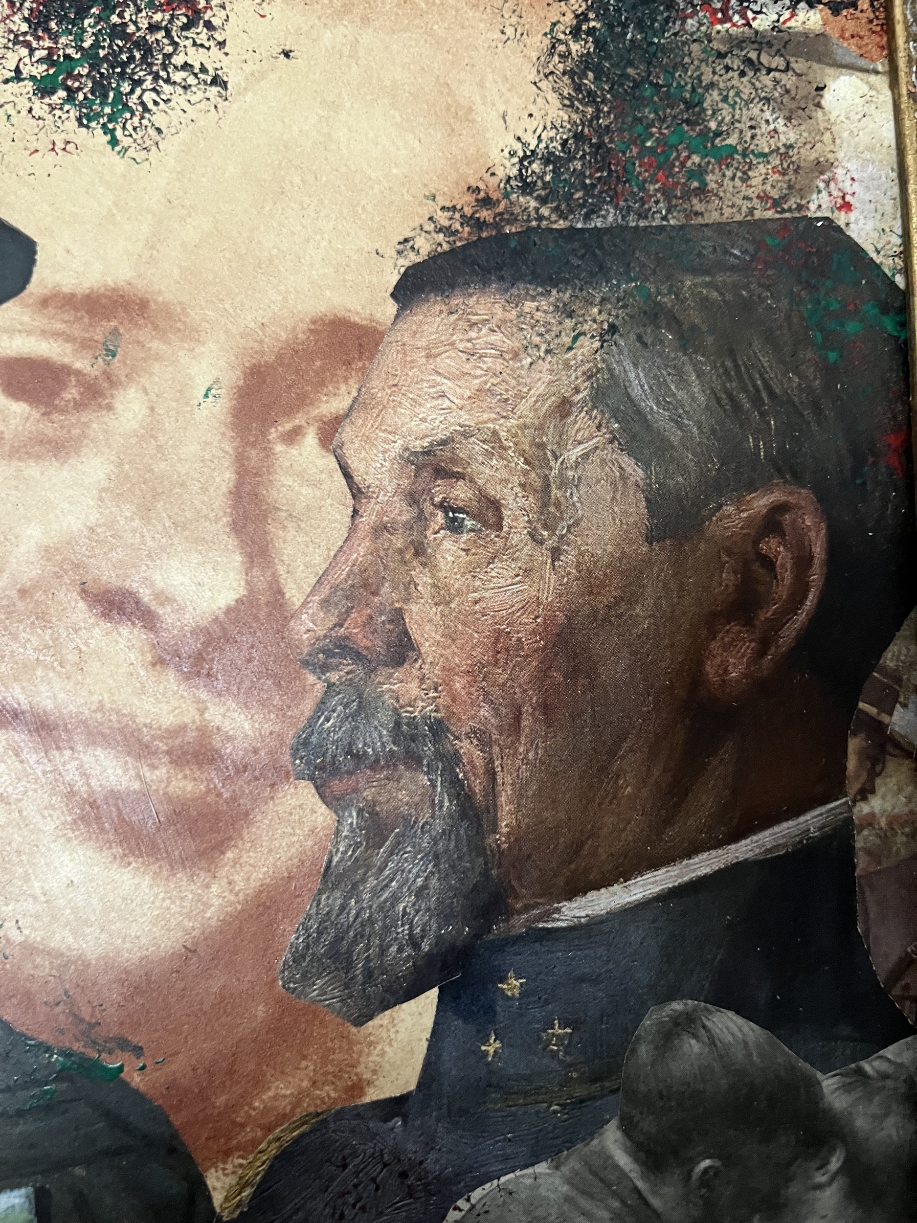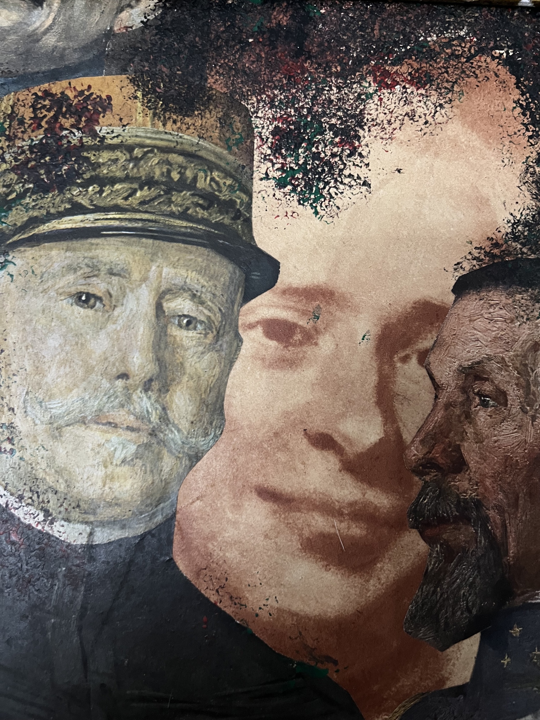 Beautifully done and intricately detailed decoupage depicting the facets, emotions and propaganda of war. The more you look the more you see.