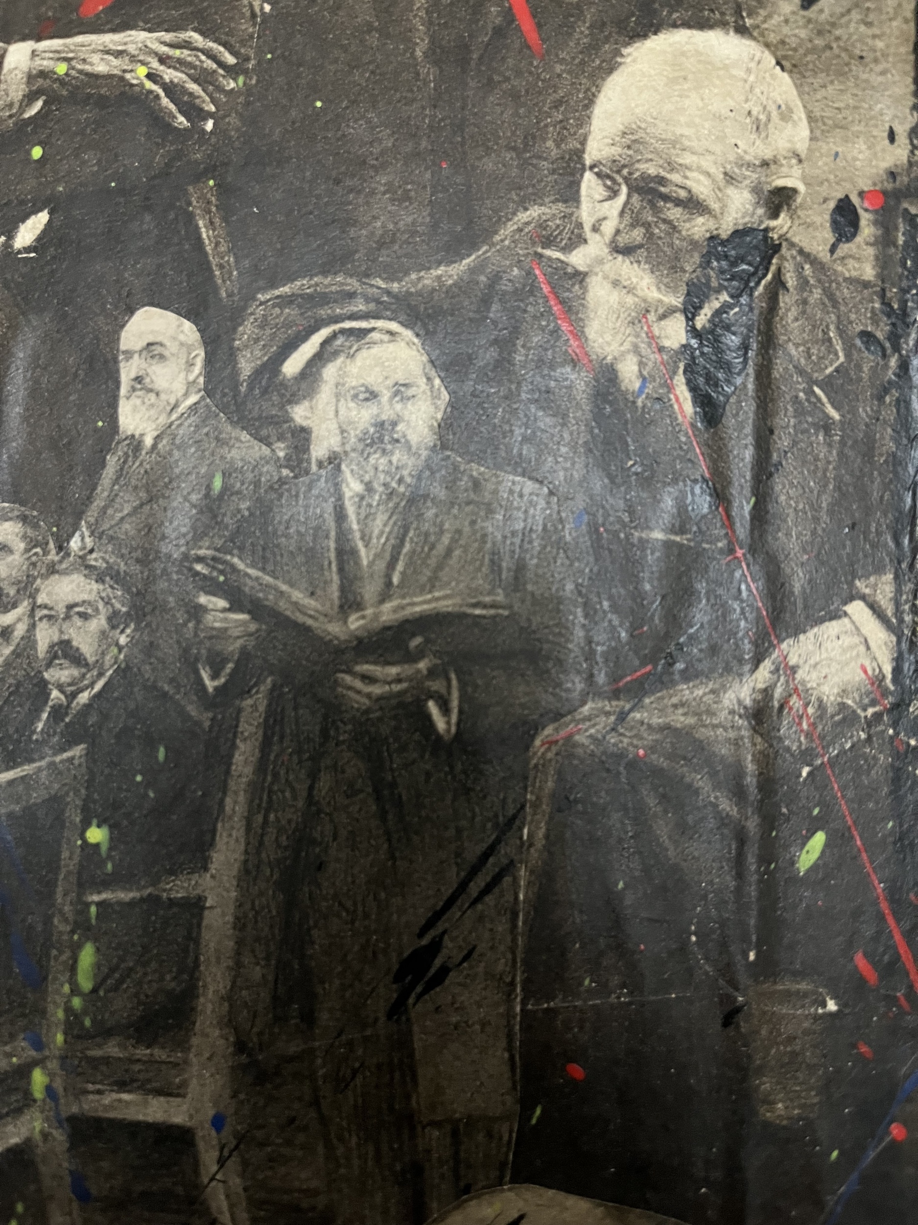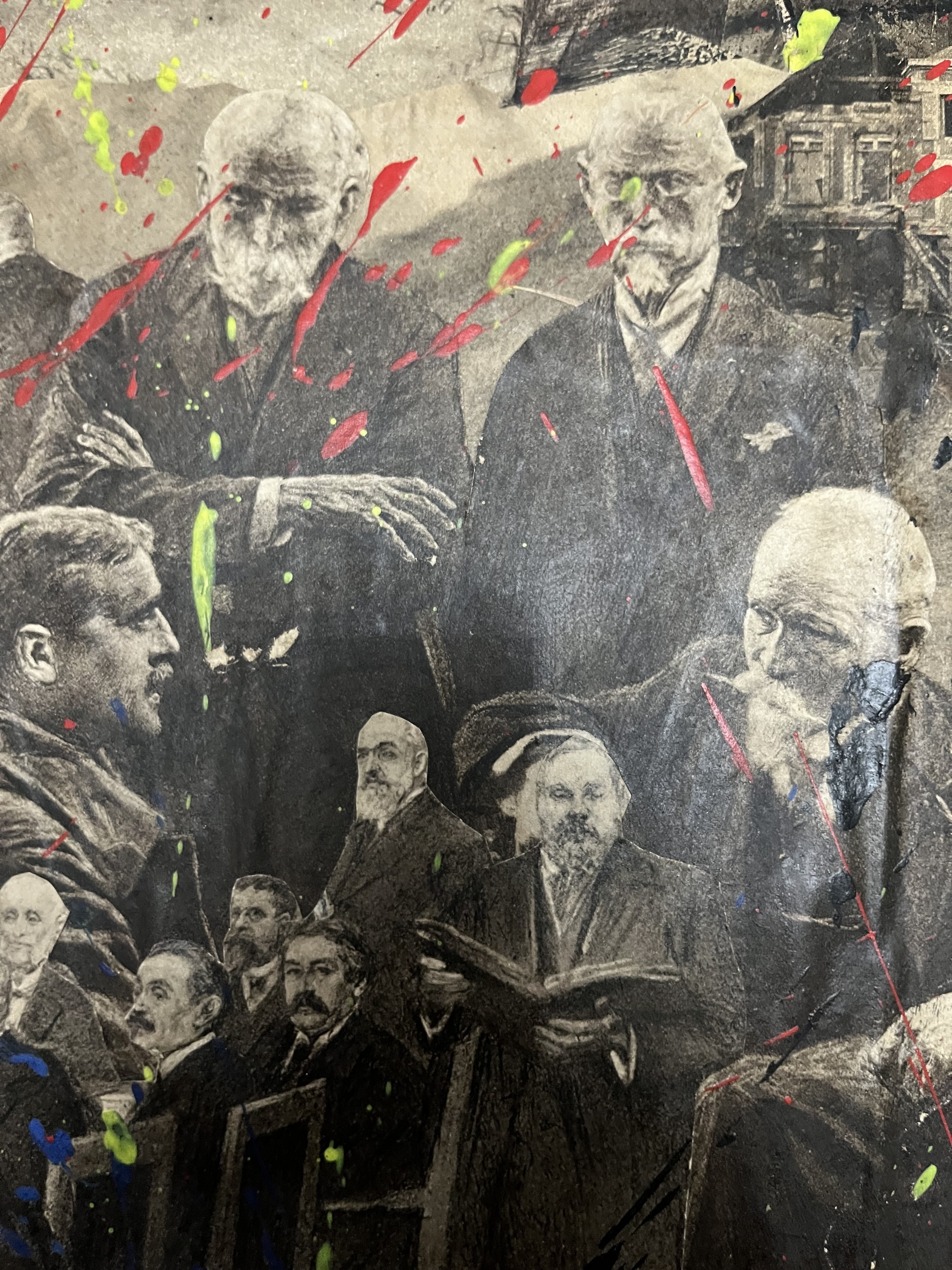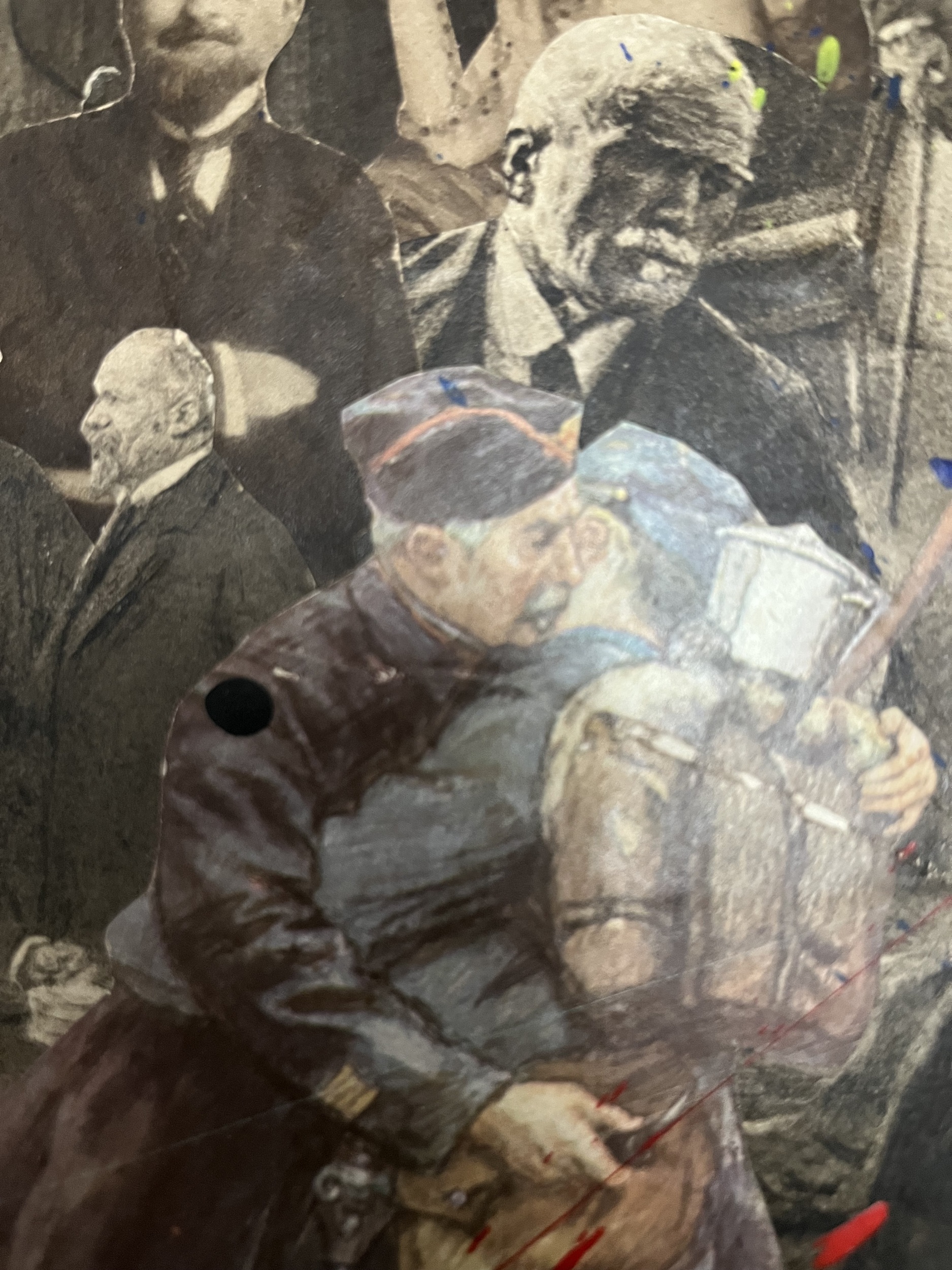 Beautifully done and intricately detailed decoupage depicting the facets, emotions and propaganda of war. The more you look the more you see.