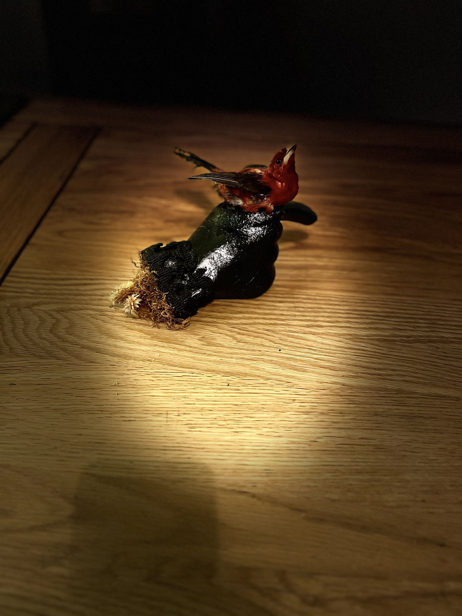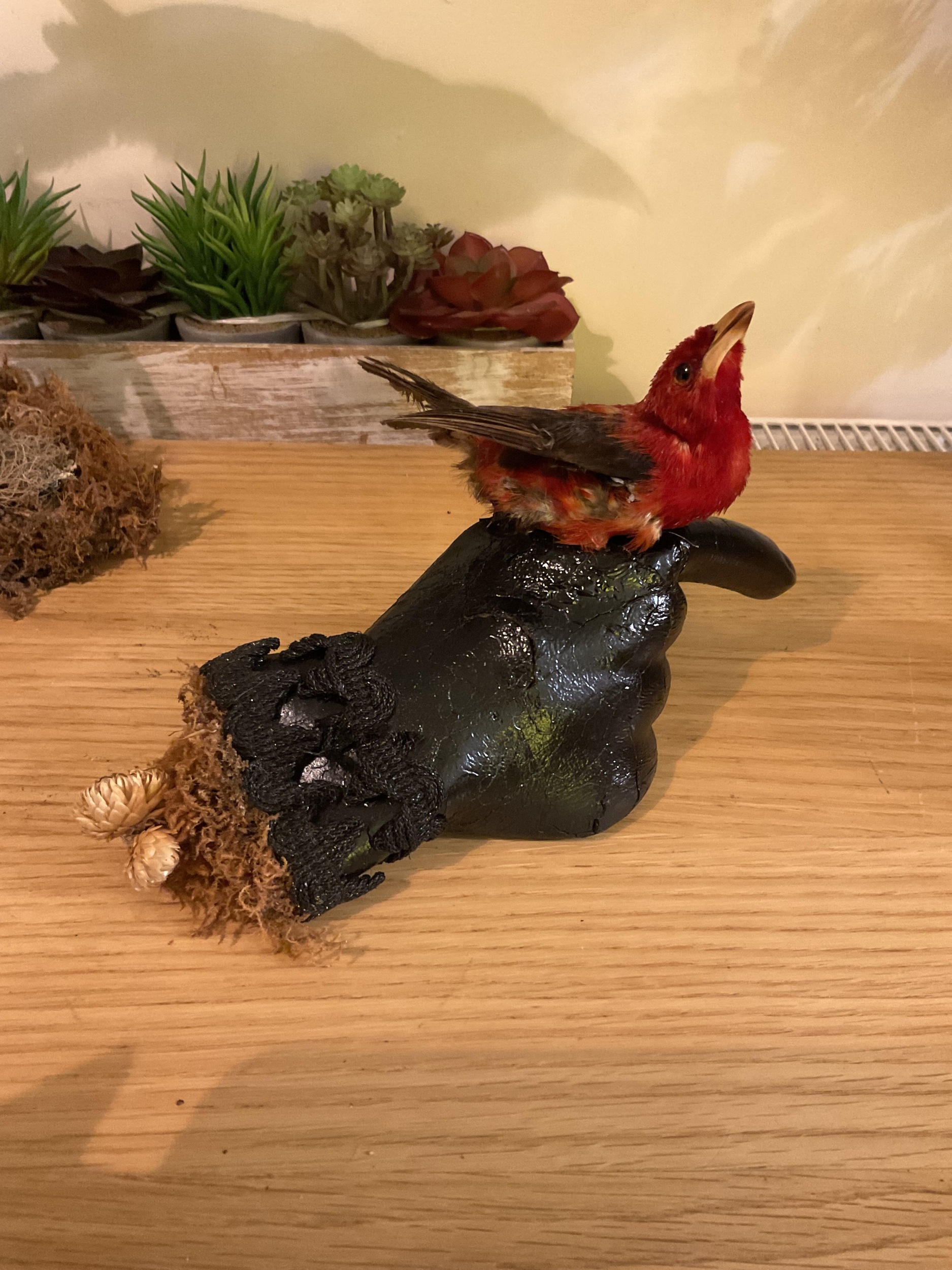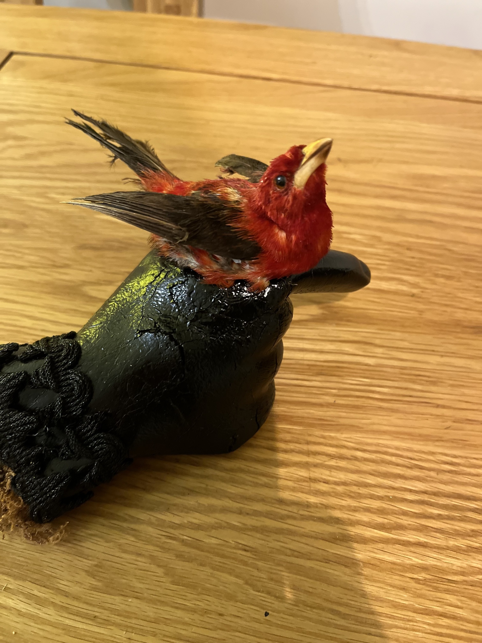 Imaginatively presented antique tropical red bird taxidermy sitting on a 1930s era mannequin display hand.