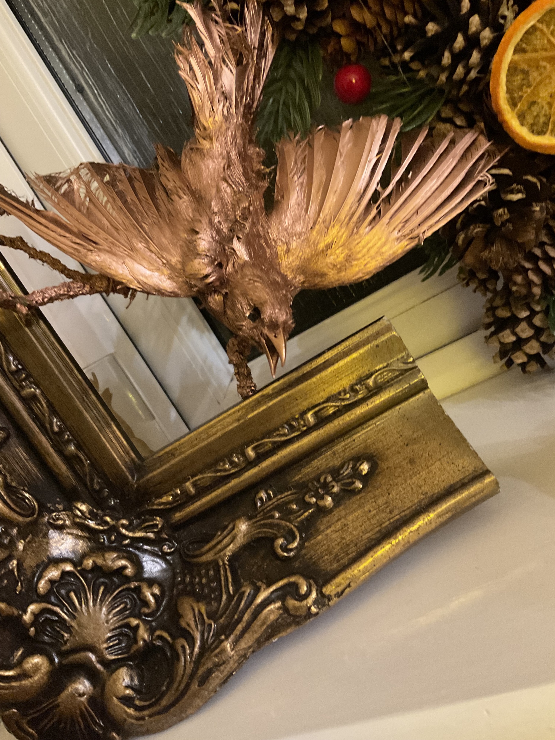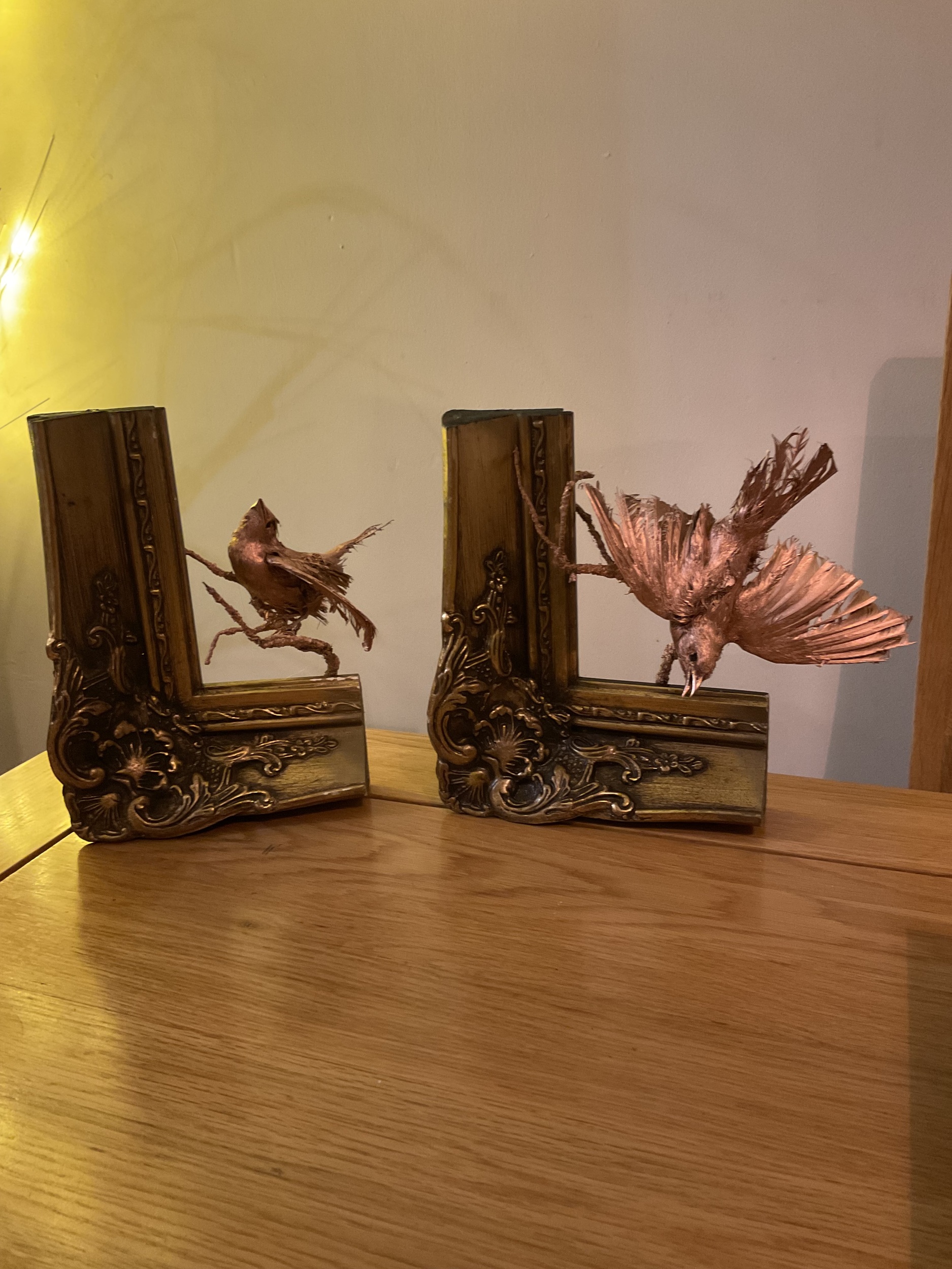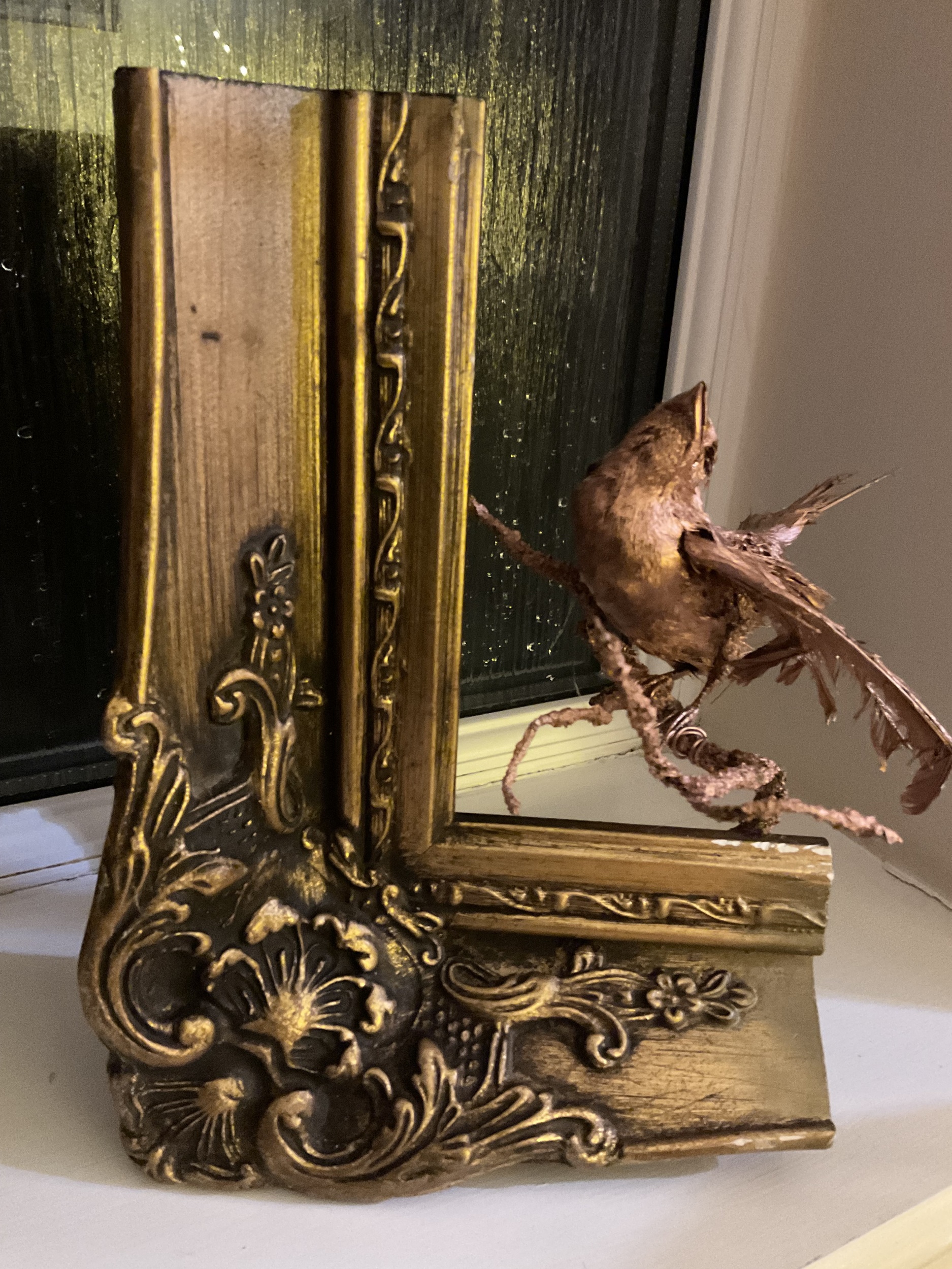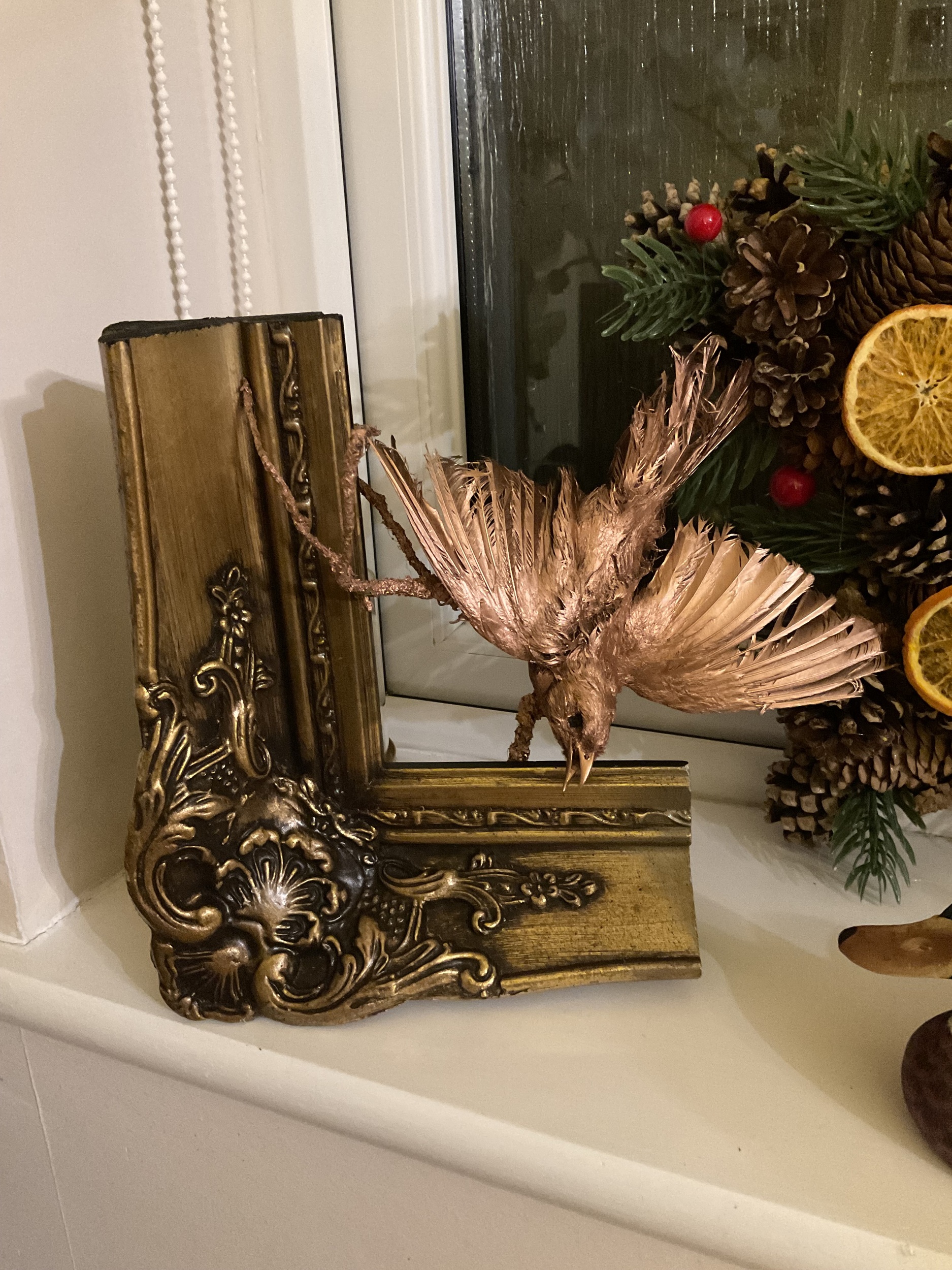 Presented here on vintage frame corners are these imaginatively mounted taxidermy birds that now make for pieces of decorative art.