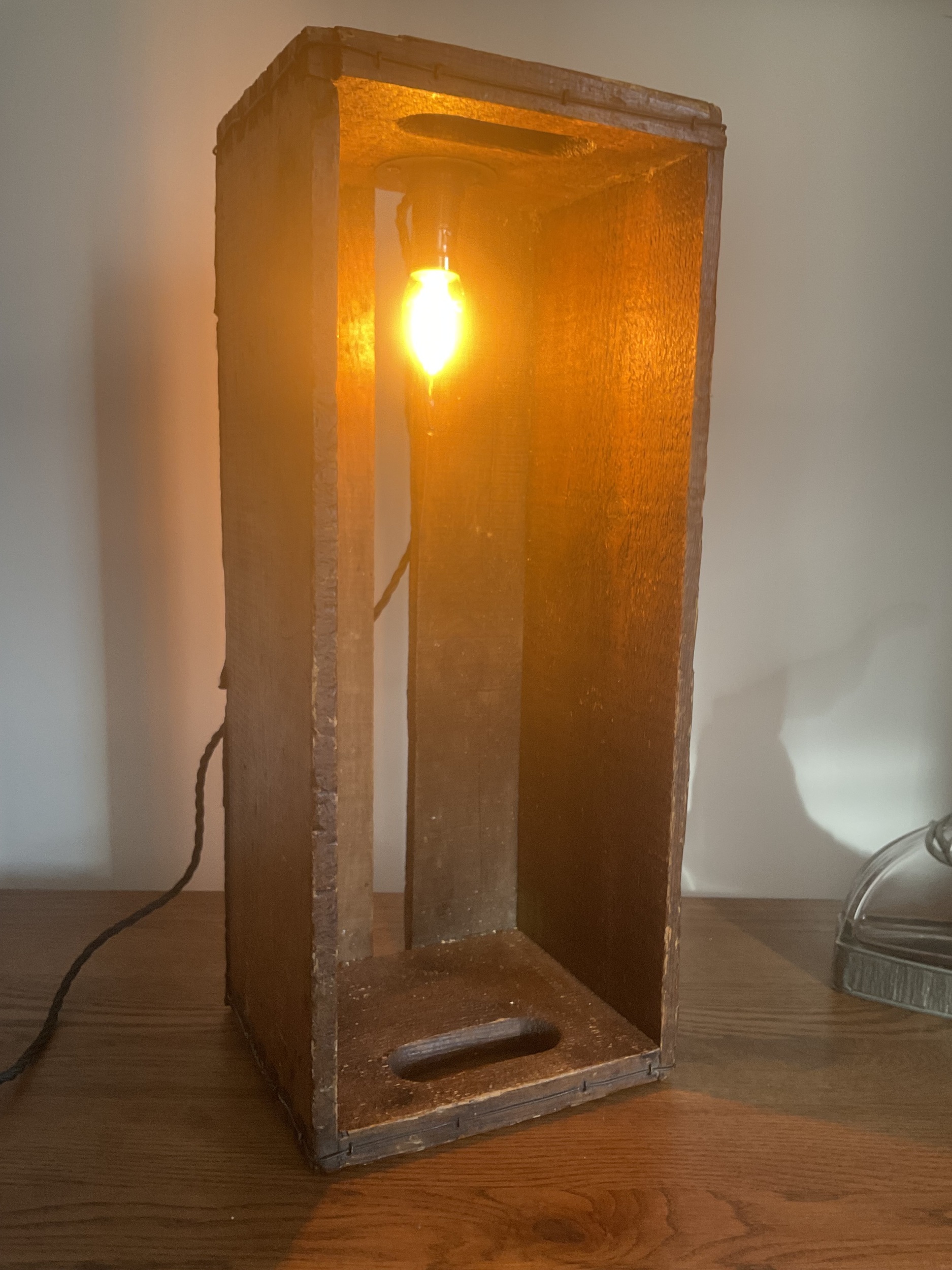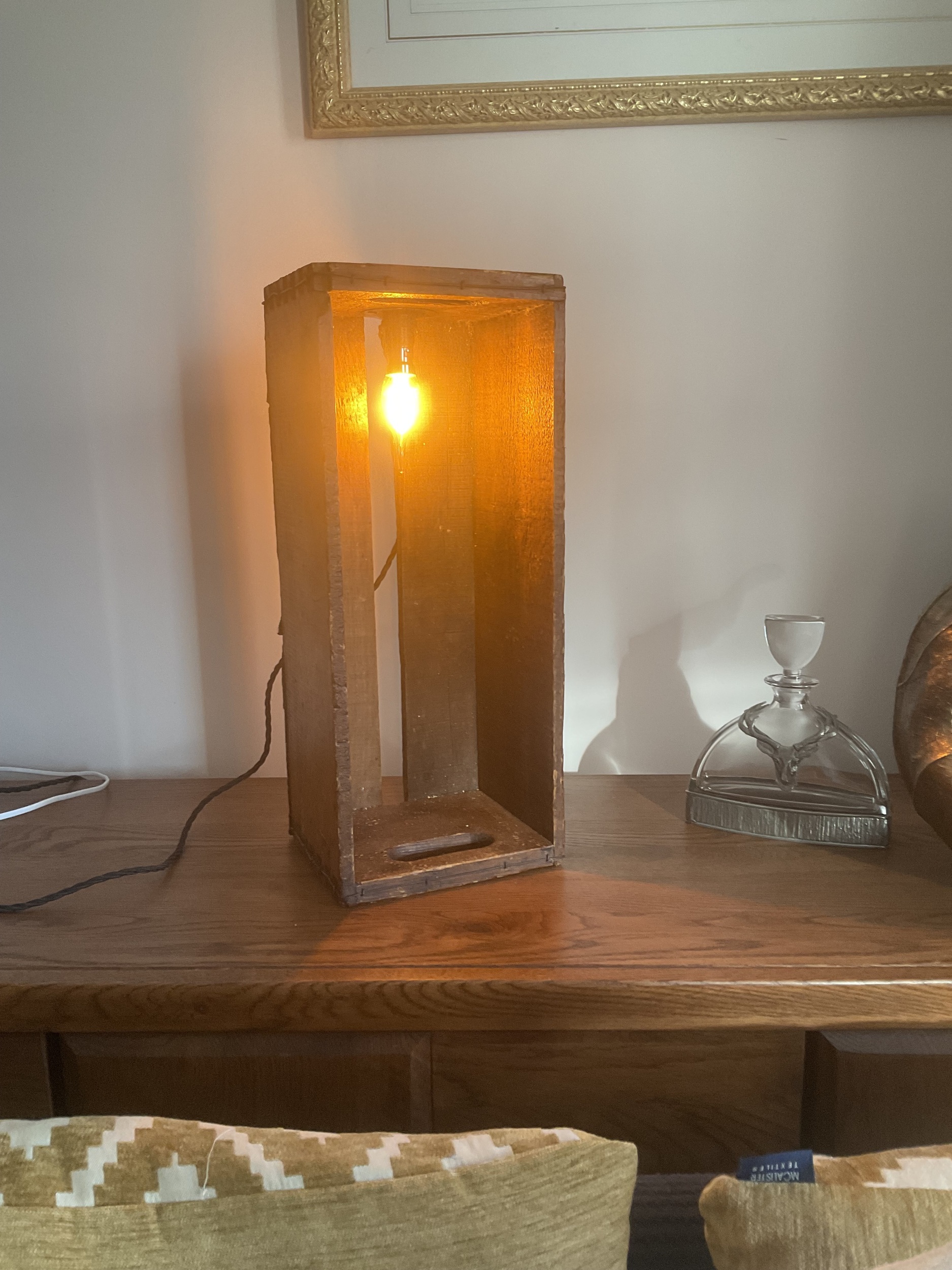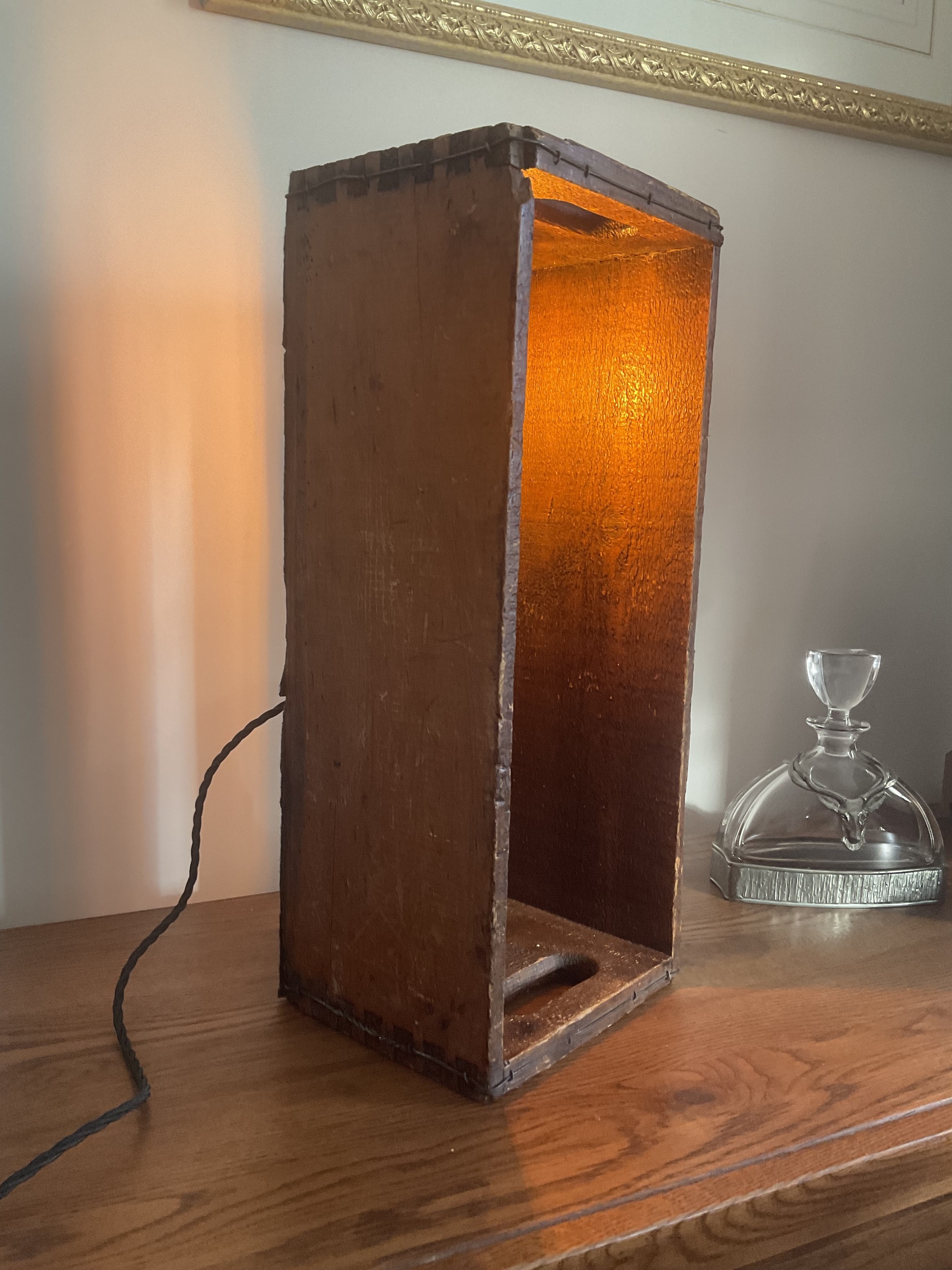What I love. Taking an old vintage pine drinks crate and creating an atmospheric lamp for any room or workspace.