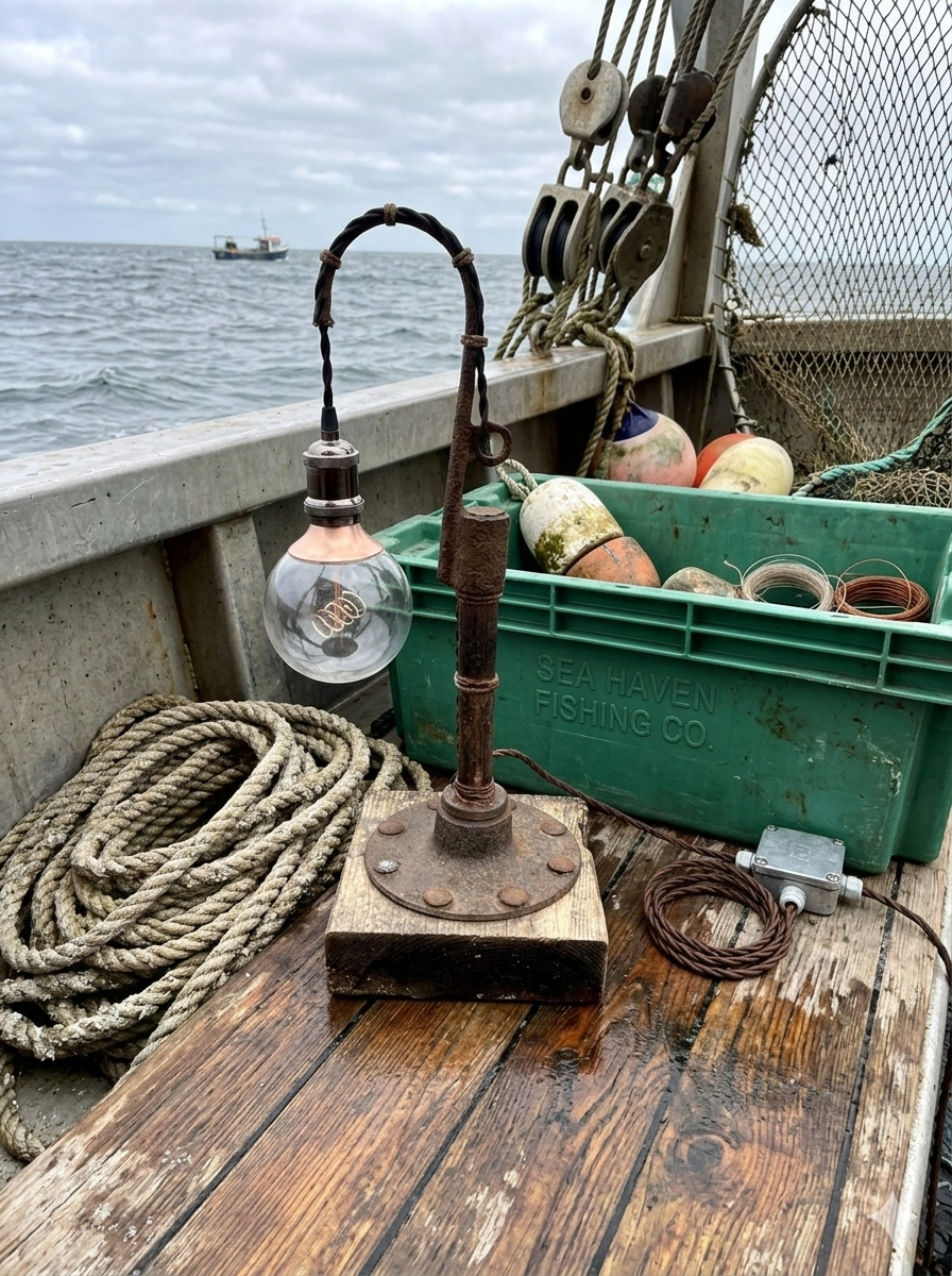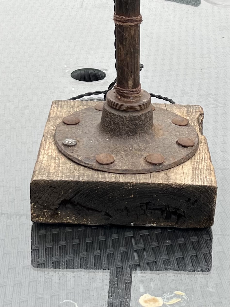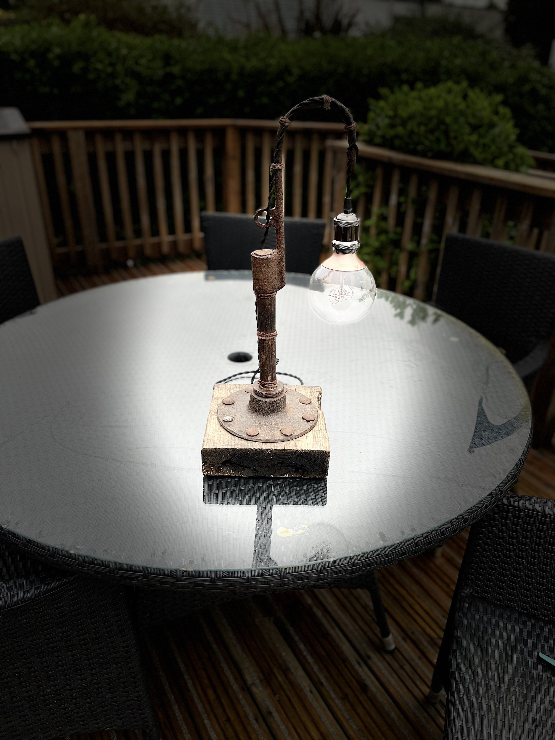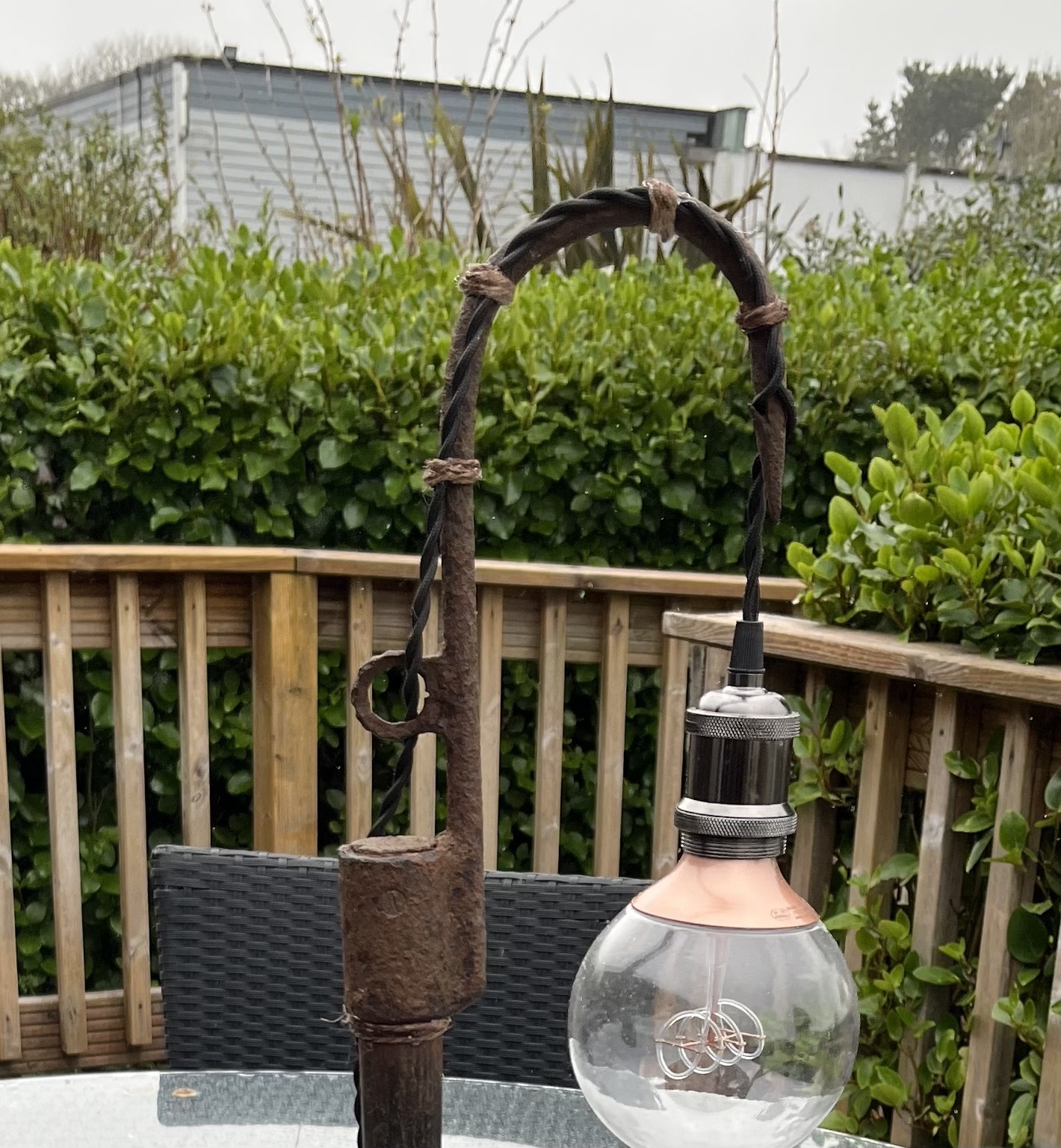 Interesting and slightly grisly lamp made using a large antique fishing gaff, possibly for tuna or bigger specimens, very large with barb and on original wooden shaft. This has been beautifully mounted and is a truly unique piece of functional art.