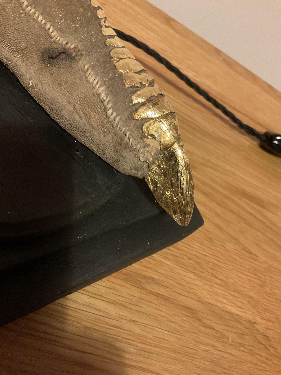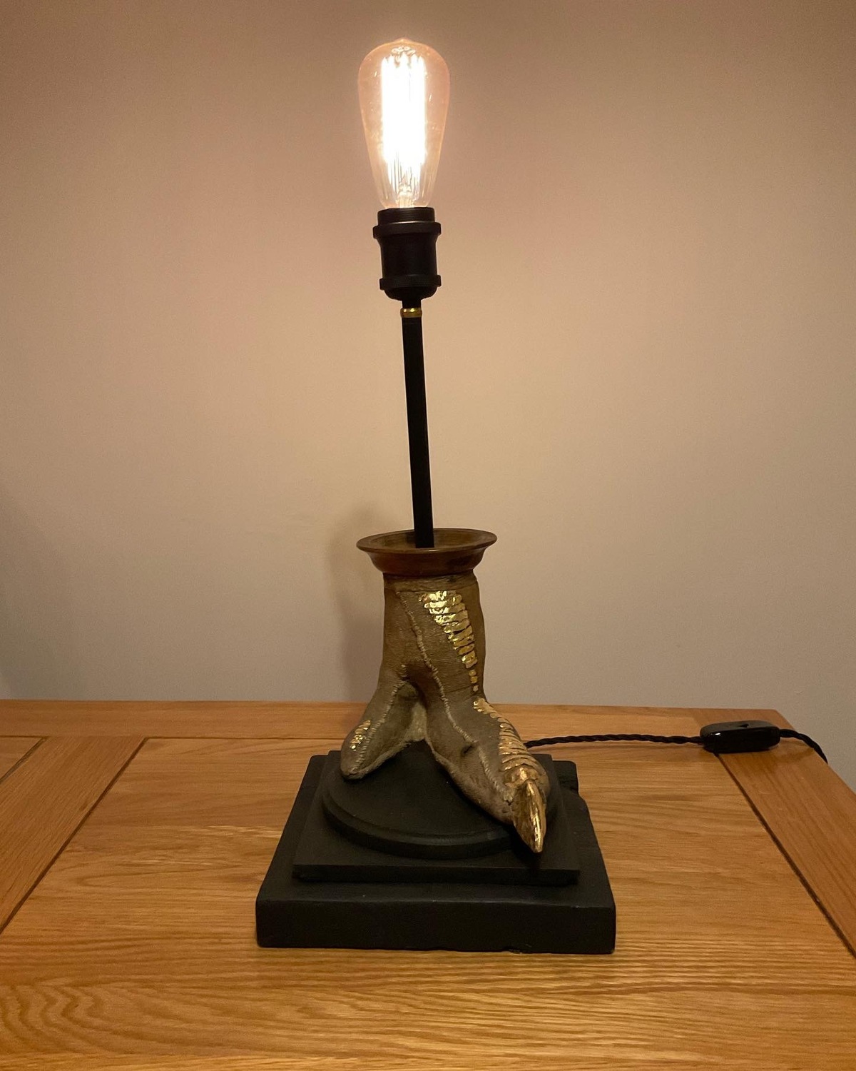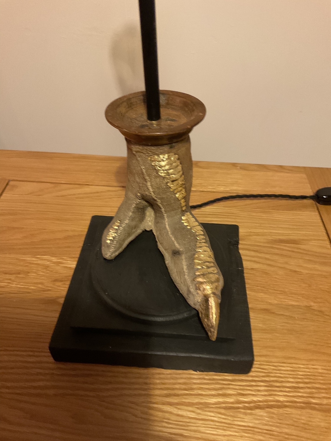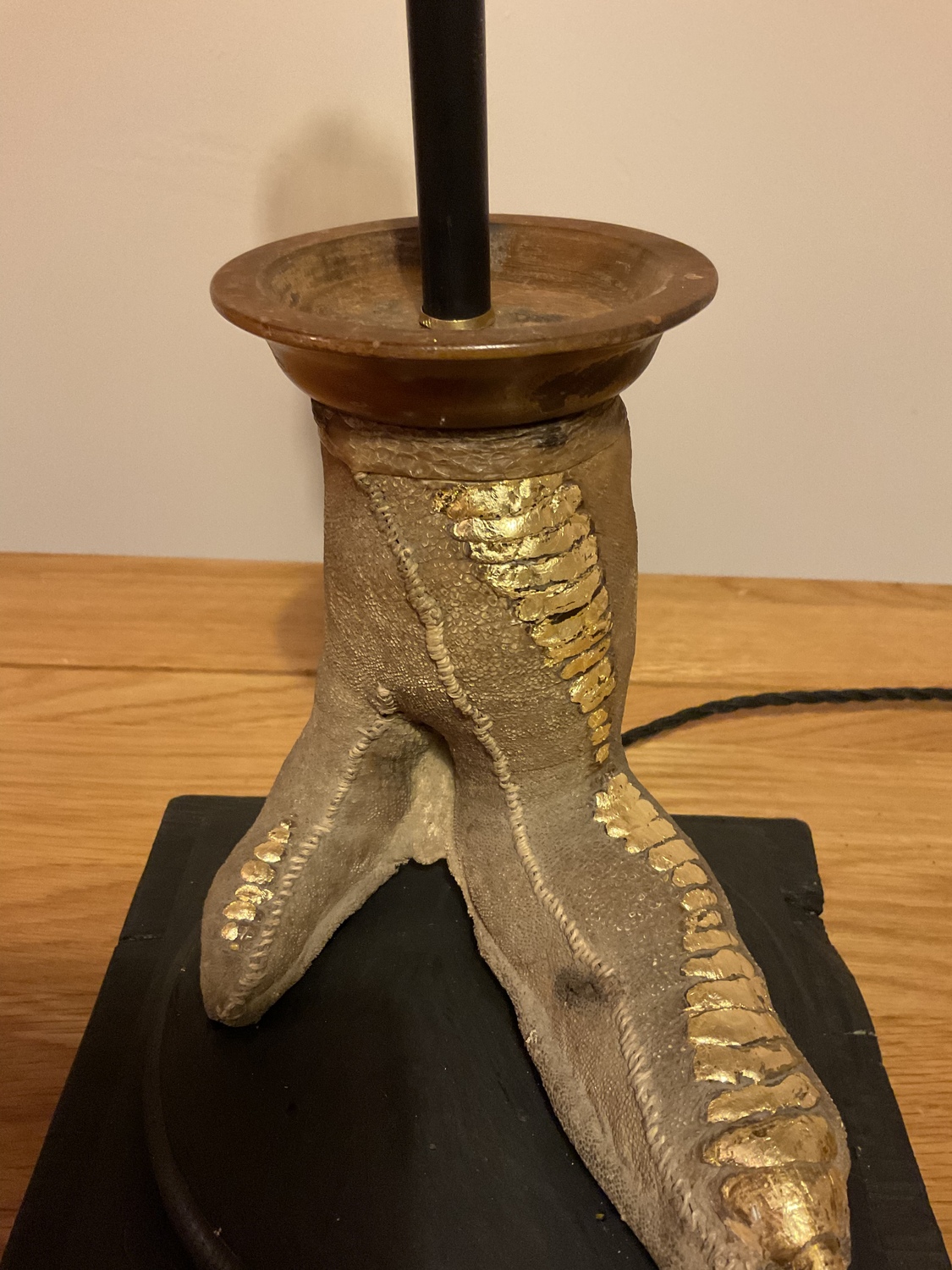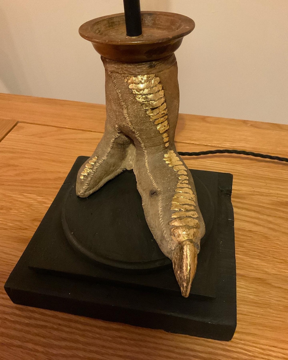 Here we have taken an old taxidermy ostrich foot, interesting enough on its own but we have gold leafed the talon and scales then converted into one cool unique lamp. Another true one off from the Crap Shack.